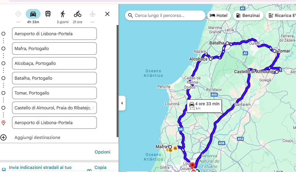 - Dove dormire: per chi non desidera noleggiare l’auto è consigliato dormire a Lisbona, per chi invece valuta di noleggiare l’auto vi consiglio di dormire a Leiria o Caldas da Rainha per raggiungere Mafra, Alcobaça e Batalha, mentre per Tomar è possibile dormire lì nel suo centro storico per visitare il Convento e il suo centro storico.